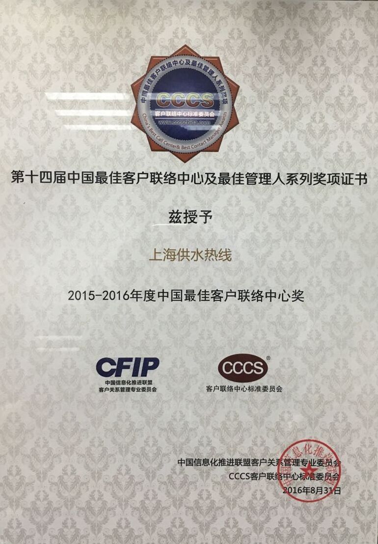 本次大會(huì)還頒發(fā)了最佳客戶聯(lián)絡(luò)中心及最佳管理人系列獎(jiǎng)項(xiàng),“上海供水熱線”榮獲“2015-2016年度中國(guó)最佳客戶聯(lián)絡(luò)中心”稱號(hào)。這也是“上海供水熱線”連續(xù)第七年獲得該榮譽(yù)。